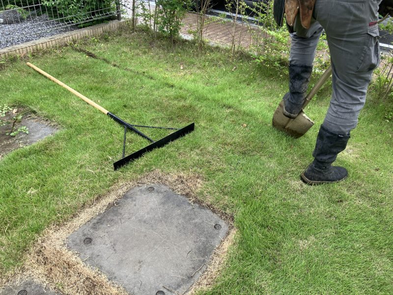 土を掘り起こす作業です。カーポートやテラス、アプローチ、などなど外構物を施工する際には頑丈な【基礎】を作る必要があるので余分な土を掘り起こすのです。