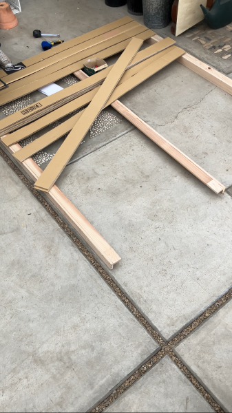 今回は段ボールでフェンス横板を、木でフェンス柱を作ってくれました
