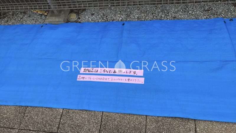 配送スタッフの方が現場に部材を納品してくれる前日までにグリーングラスの方でパイロンとブルーシートで納品場所を作成