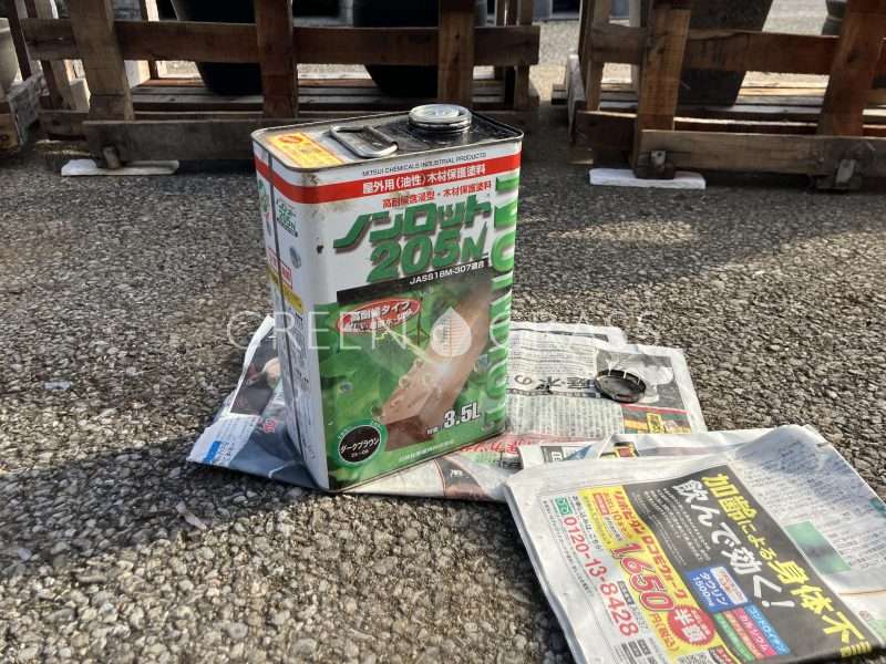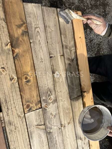 木のボックスの上に板を並べ、保護材を塗布してと。