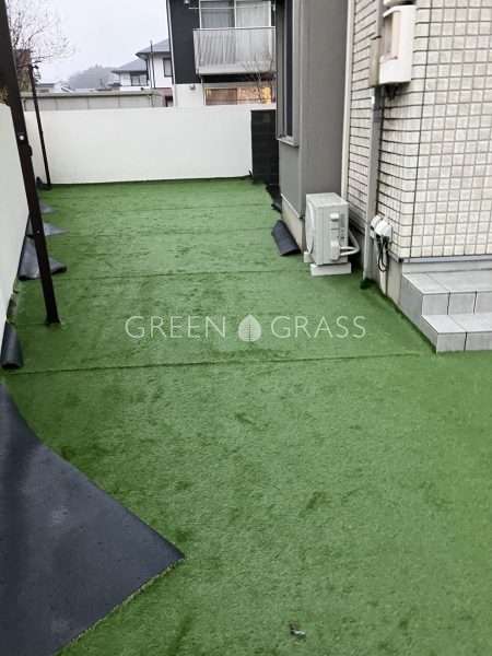人工芝ってロール状で現場に納品されるので施工直後は芝の葉がぺたーっとしています。