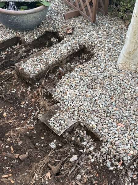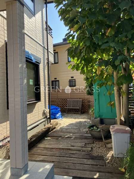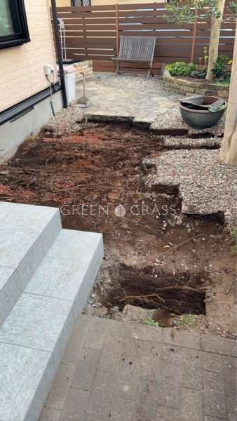 こちらの天然枕木を撤去し乱形石アプローチを新設させていただきましたよ