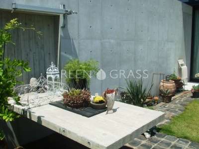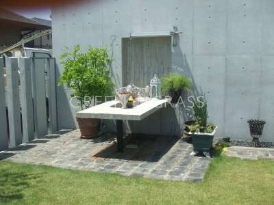 コンクリートのテーブルにレンガ敷きのテラス