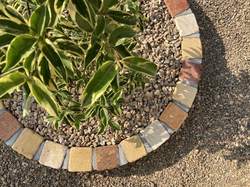 円形花壇にはカラフルな石材をランダムに配置し色の変化を楽しめる仕上げに。植物は珍しい【斑入り常緑ヤマボウシ】を採用。