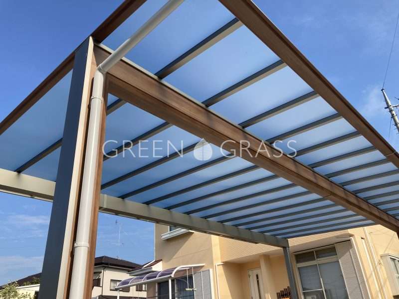 屋根の縁部分と前梁部分に明るいブラウンにすると自然石や植物に調和してくれるカーポートの完成。