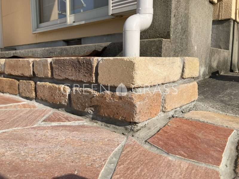竪樋の水がアプローチを汚してしまわないようにレンガで囲わせていただきました。できるだけ長くきれいに使っていただけるようちょっとした一工夫です。