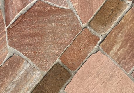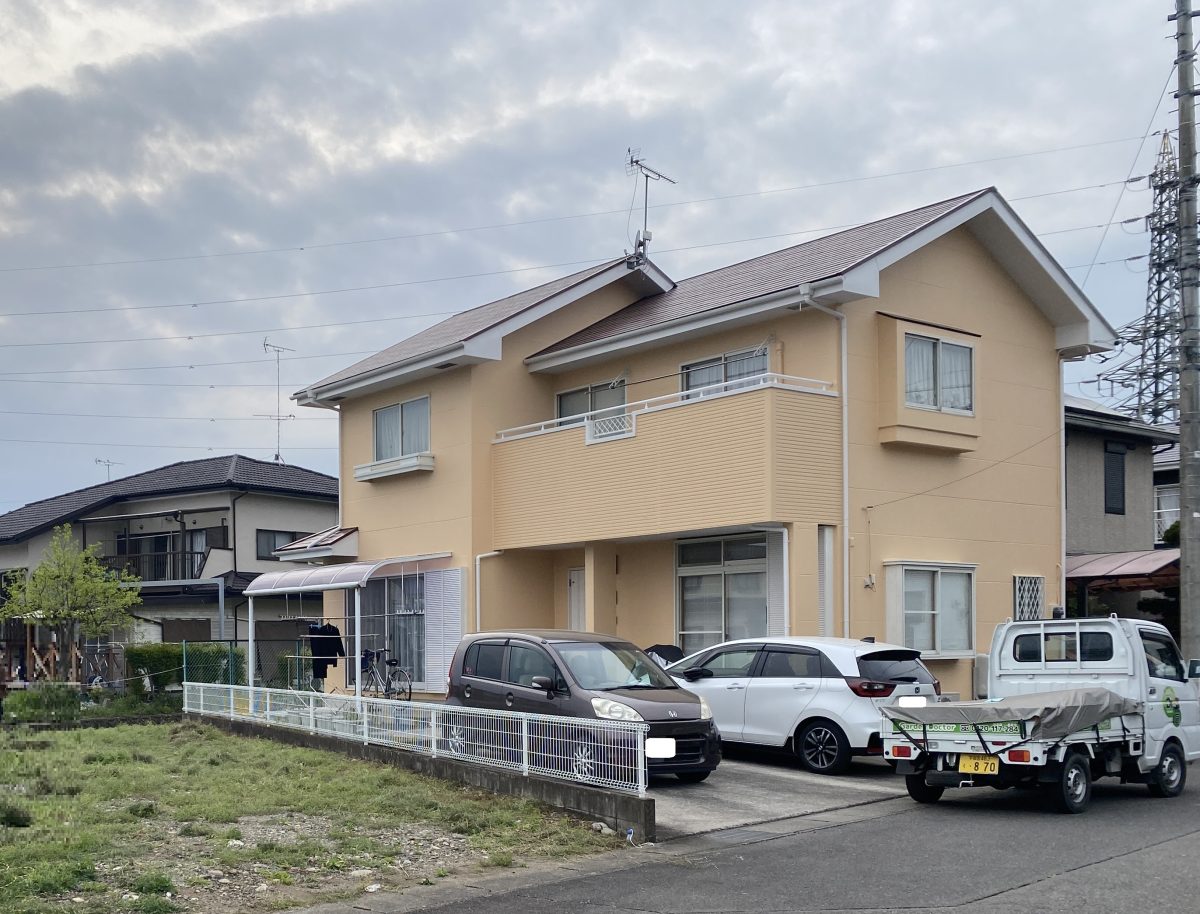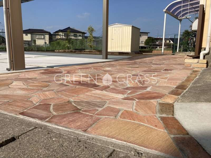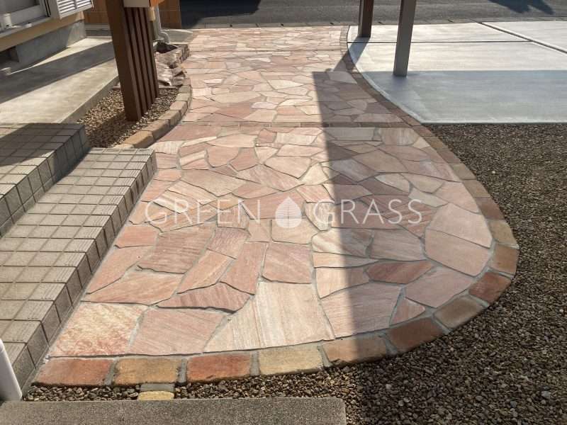 アプローチはイエロー系の外壁をより引き立ててくれるサーモンピンク系石材でまとめました