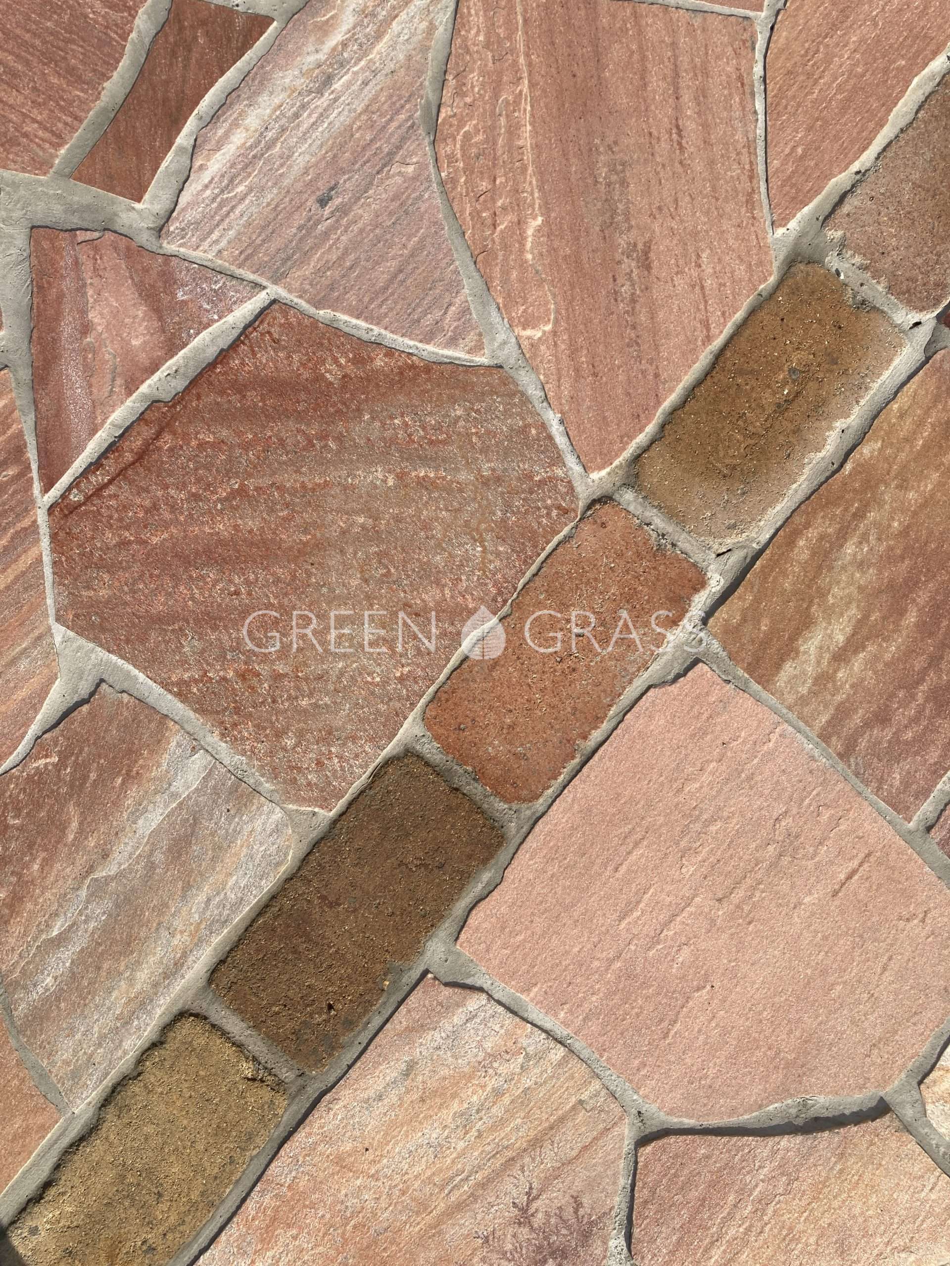 縁取りのレンガは乱形石より濃い目にしたことでアプローチ全体がぼやけずに引き締まった印象に