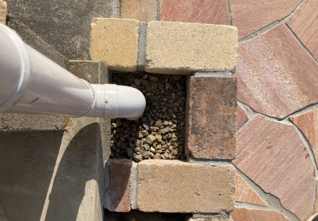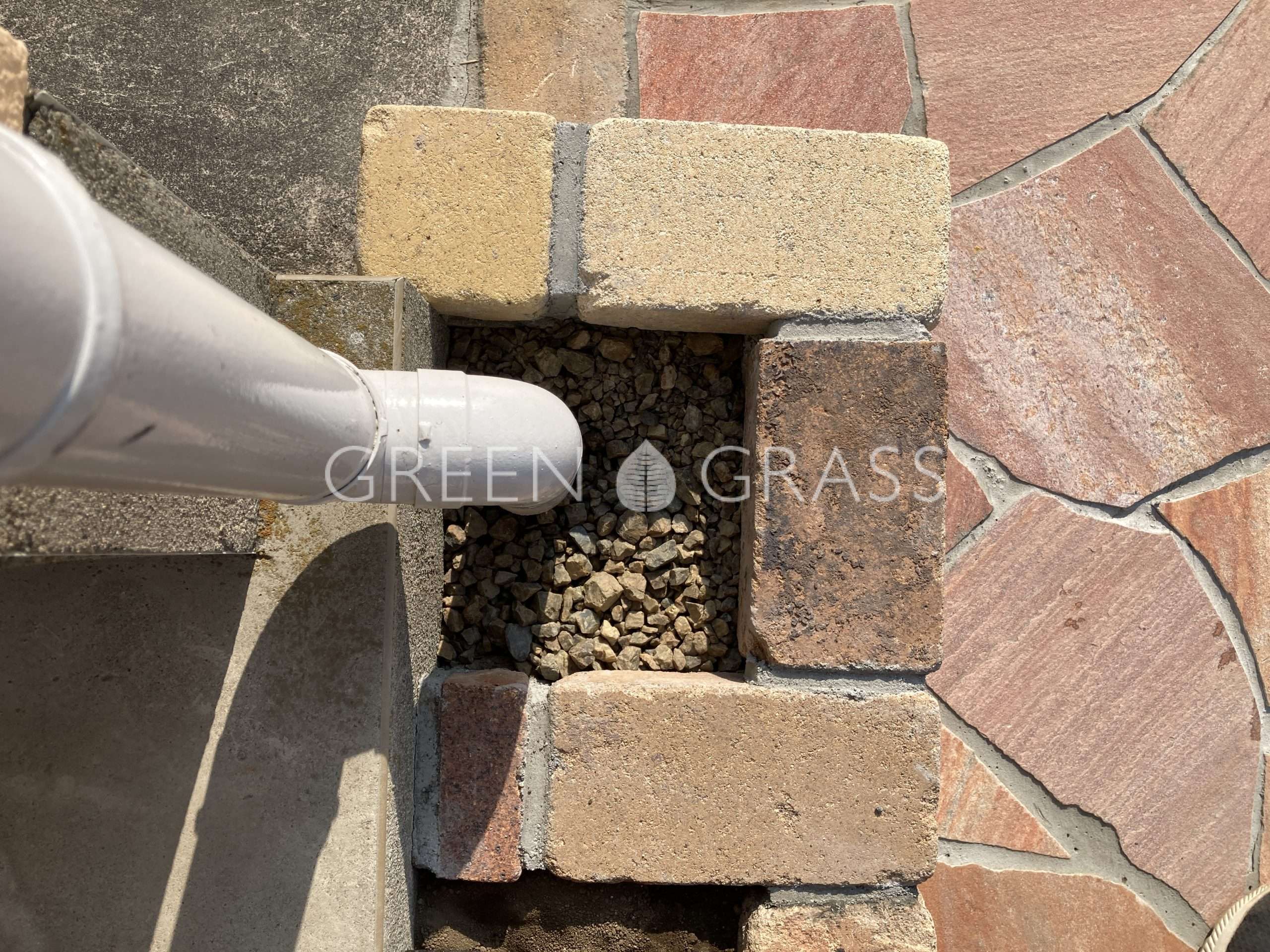 竪樋の水がアプローチを汚してしまわないようにレンガで囲わせていただきました。できるだけ長くきれいに使っていただけるようちょっとした一工夫です。